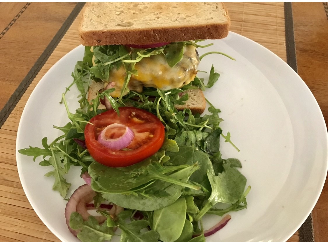 - Remove the burger from the grill and assemble the sandwich.To assemble: place a slice of the toasted oat-nut bread on a plate, add the salad greens and onions only from the prepared salad. Add two pieces of the bacon. Add the burger on top. Add another two pieces of bacon on top of the meat. Top with a slice or two of tomatoes from the salad and add more greens and onion on top. Add more salad on the side as a side dish.Enjoy!