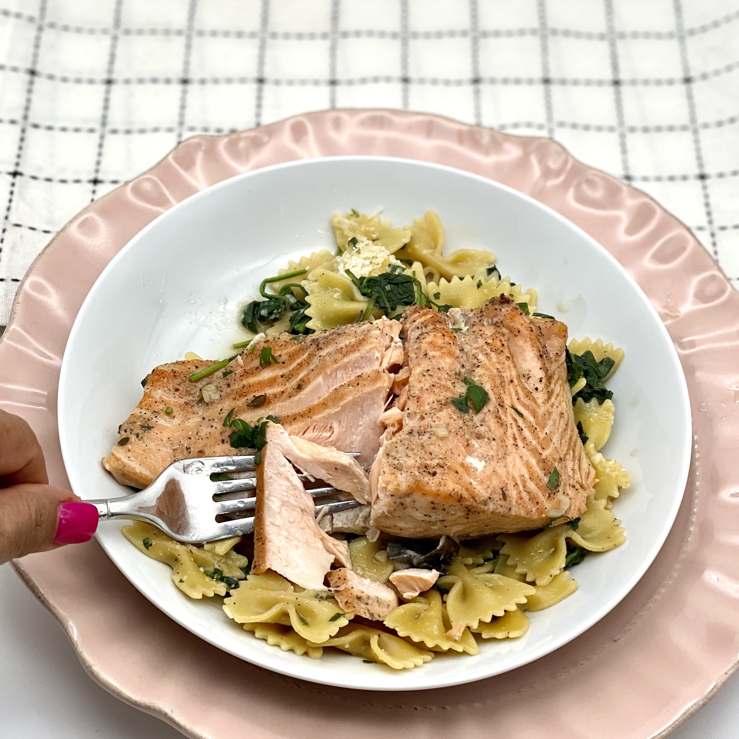 Brighten up your table with this super simple, quick and easy poached salmon entree. It is healthy and loaded with flavor. A few simple ingredients do go a long way – the salmon is flakey and moist. If you don’t have wine in the house, you can double up on the chicken broth. I served this with a bowtie pasta with spinach. I hope you will enjoy this easy and healthy salmon. Happy Cooking!
