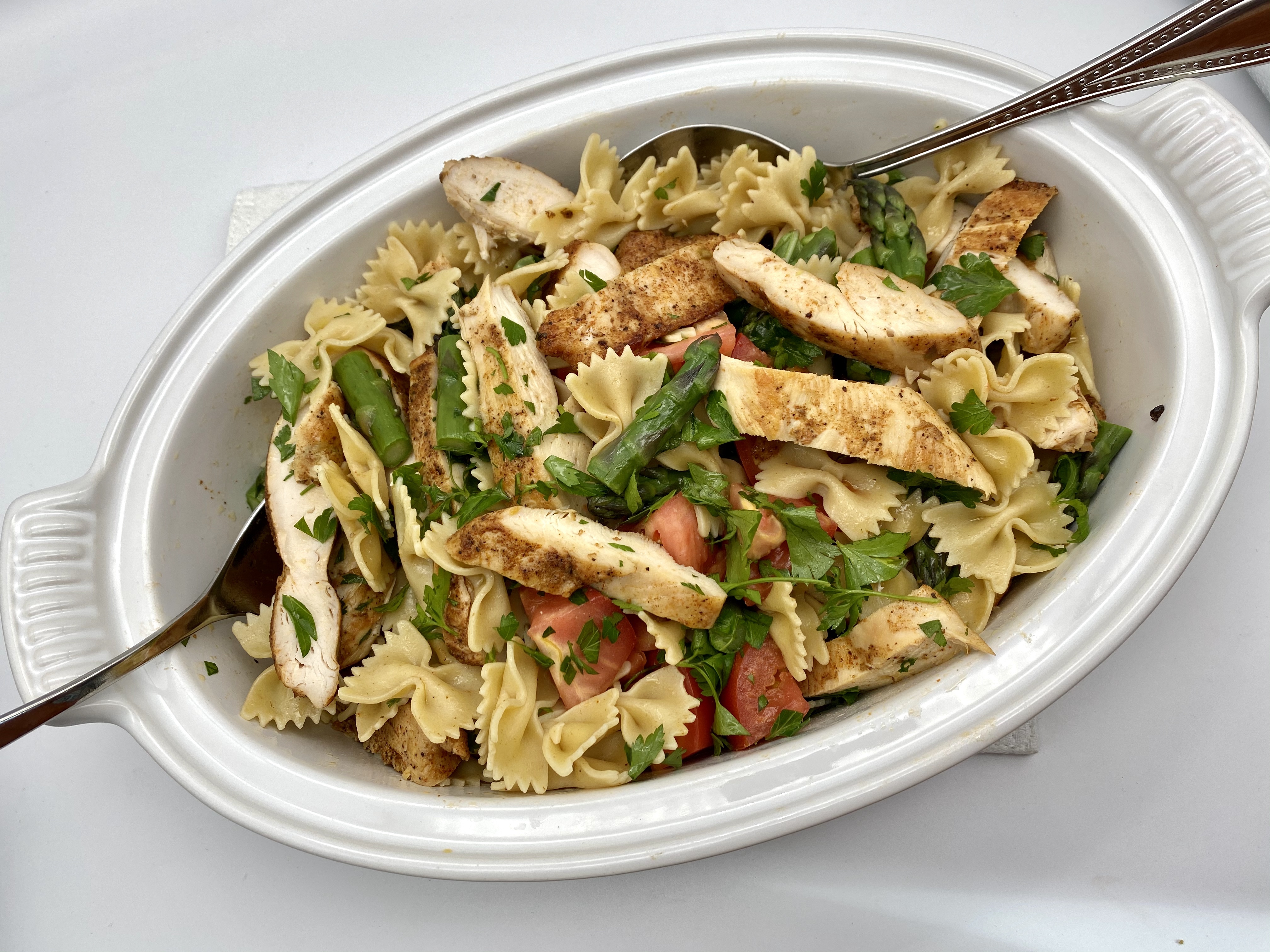 - In a large salad bowl, add the chopped tomatoes, 3/4 of the chopped parsley, all of the olives, basil (use your fingers to rip the leaves or just leave the basil leaves whole), the pasta and asparagus. Drizzle 1 to 2 tablespoons of the garlic olive oil. Mix to combine.